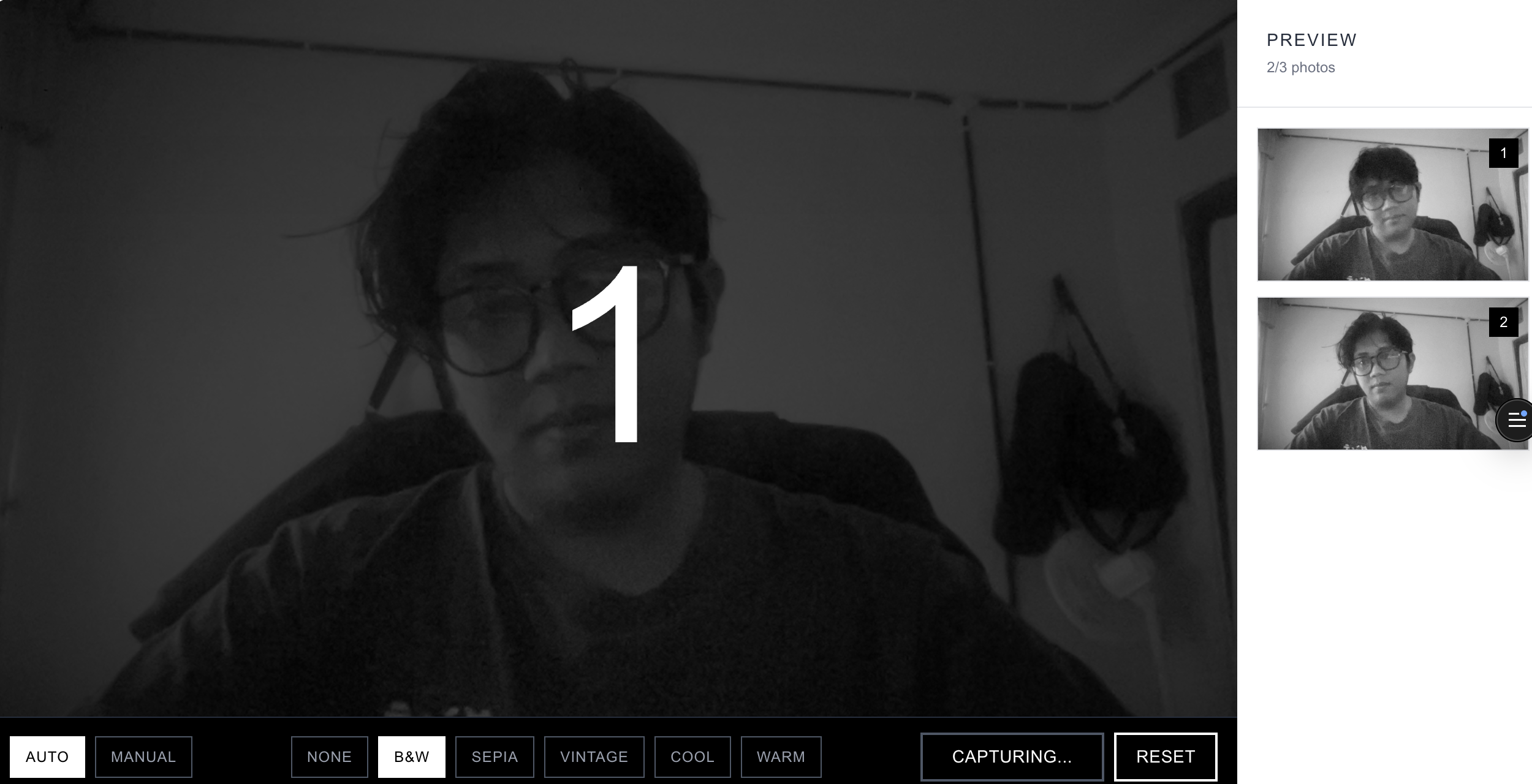 - Automatic Mode: Countdown timer (3-2-1) automatically captures 3 photos