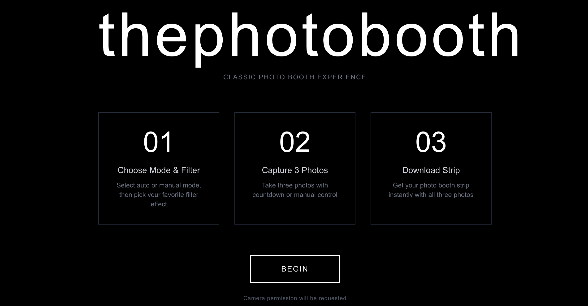 The Photo Booth is a browser-based application that recreates the classic photo booth experience. Capture 3 photos, apply filters, and download a professional photo strip—all directly in your browser.